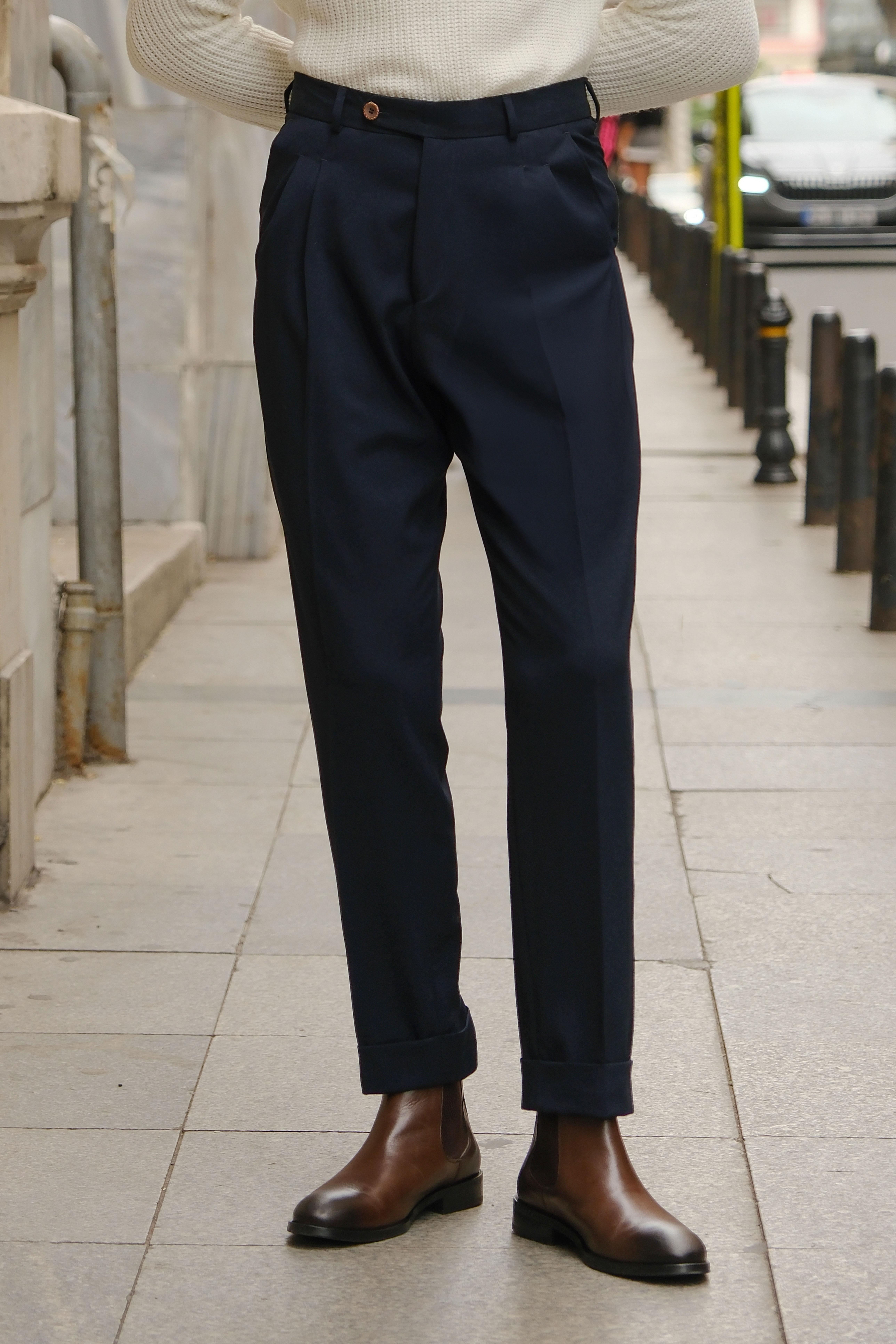 1. Kalite Lacivert İtalyan Style Çift Pileli Tek Düğme Detay Yüksek Bel Pantolon