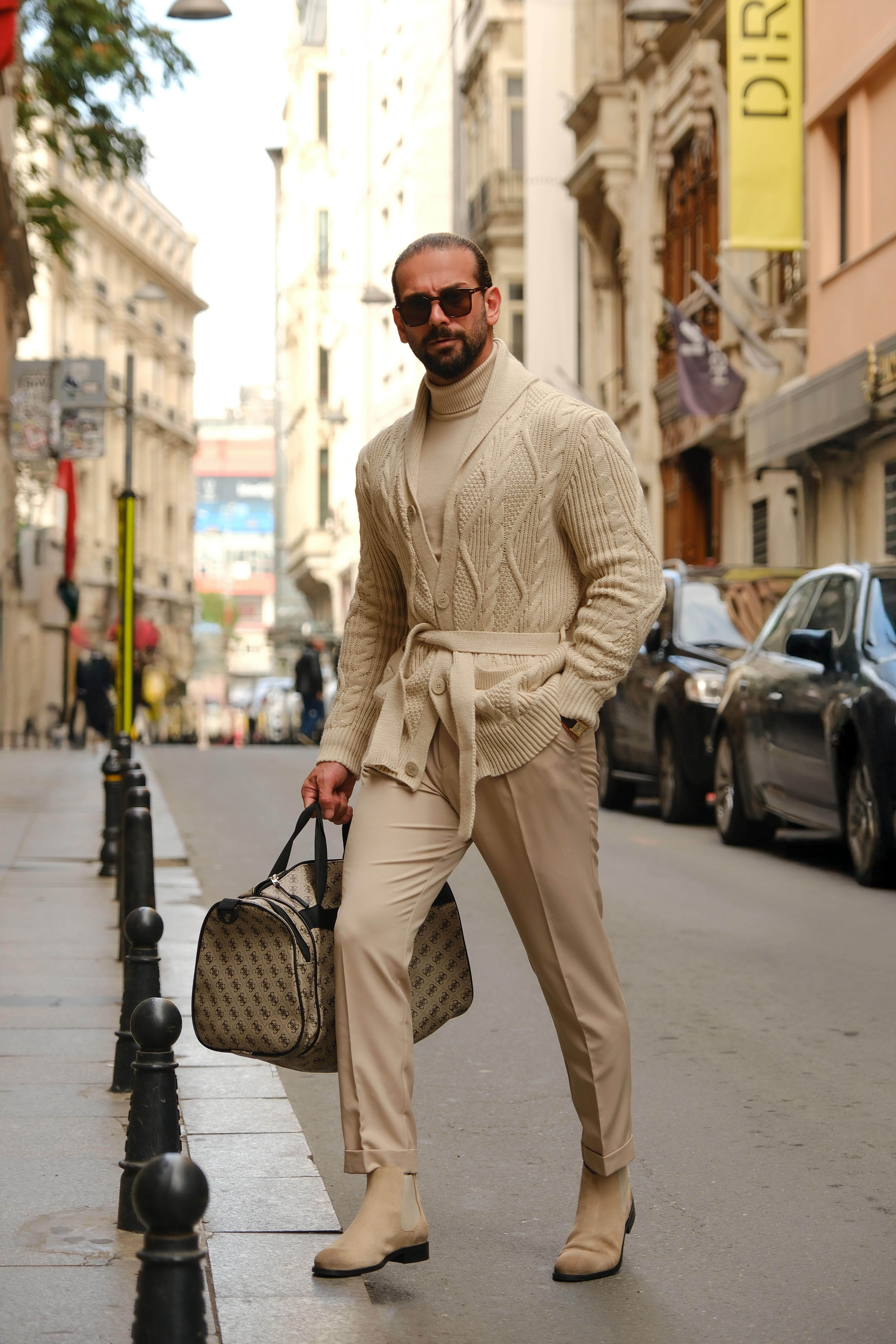 Premium Kalite Bej Rengi Özel İtalyan Style Tasarım %90 Pamuk %10 Cashmere Kuşaklı Hırka