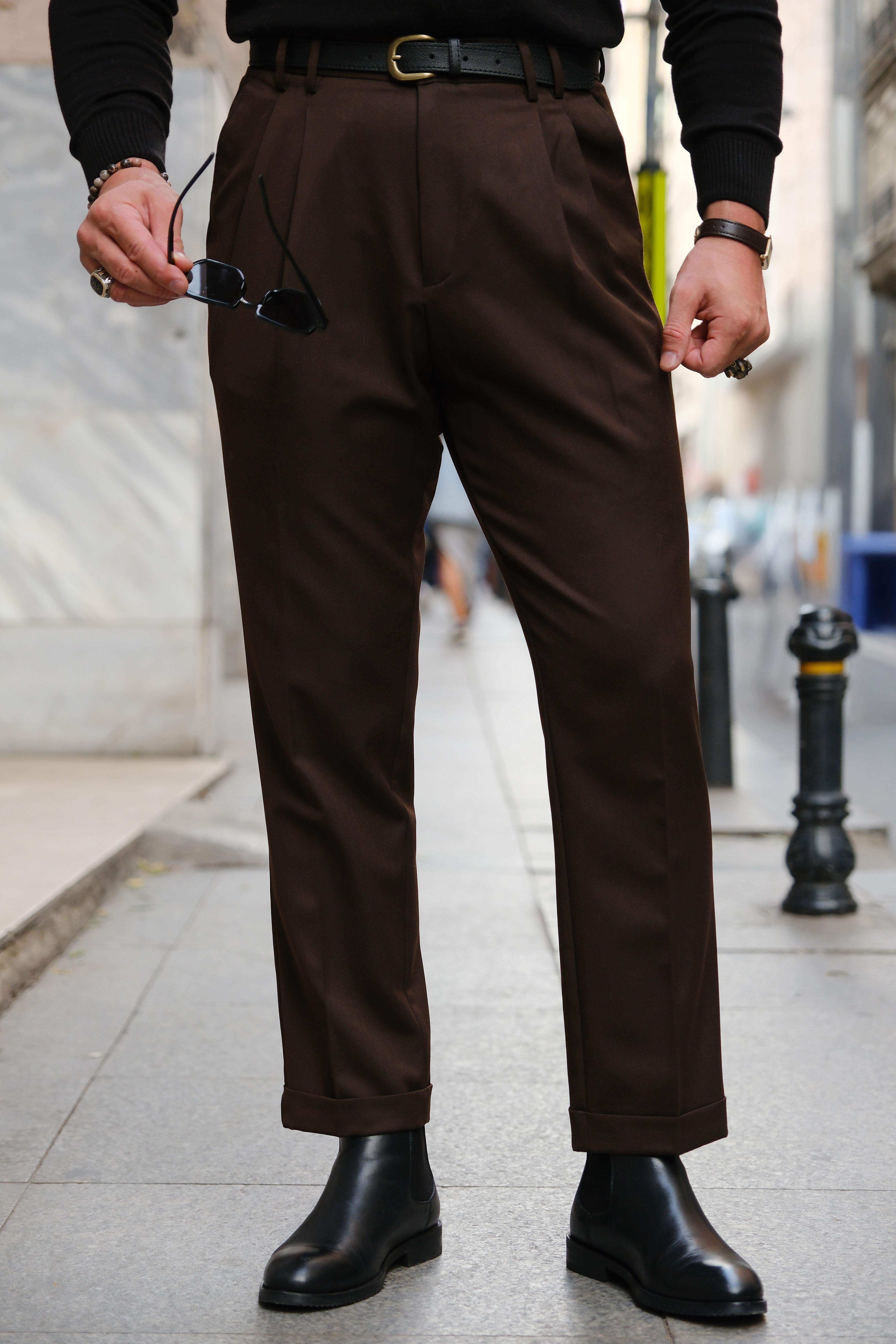 Premium Kalite Kahverengi İtalyan Kalıp Çift Köprü Çift Pile Detay Yüksek Bel Pantolon