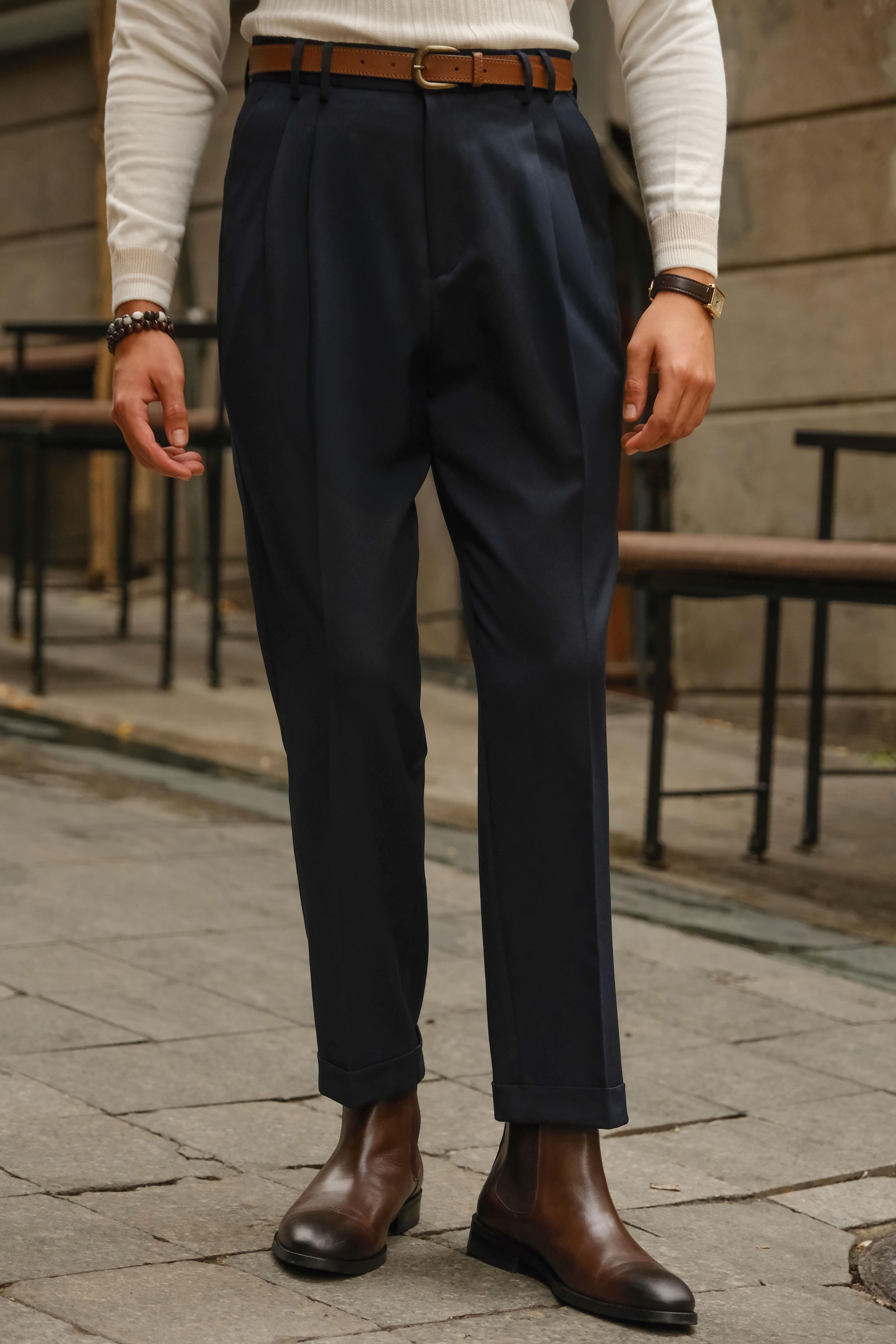 Premium Kalite Lacivert İtalyan Kalıp Çift Köprü Çift Pile Detay Yüksek Bel Pantolon